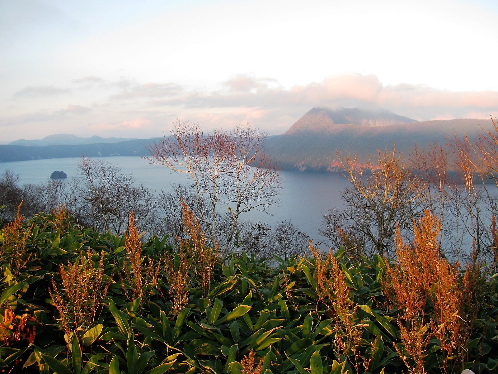 後ろに目をやると、『屈斜路湖、硫黄山が、暮れなずむ夕陽を受けて、光り輝いている・・・』と、まあこんなところでしょう。小生的には満足です。