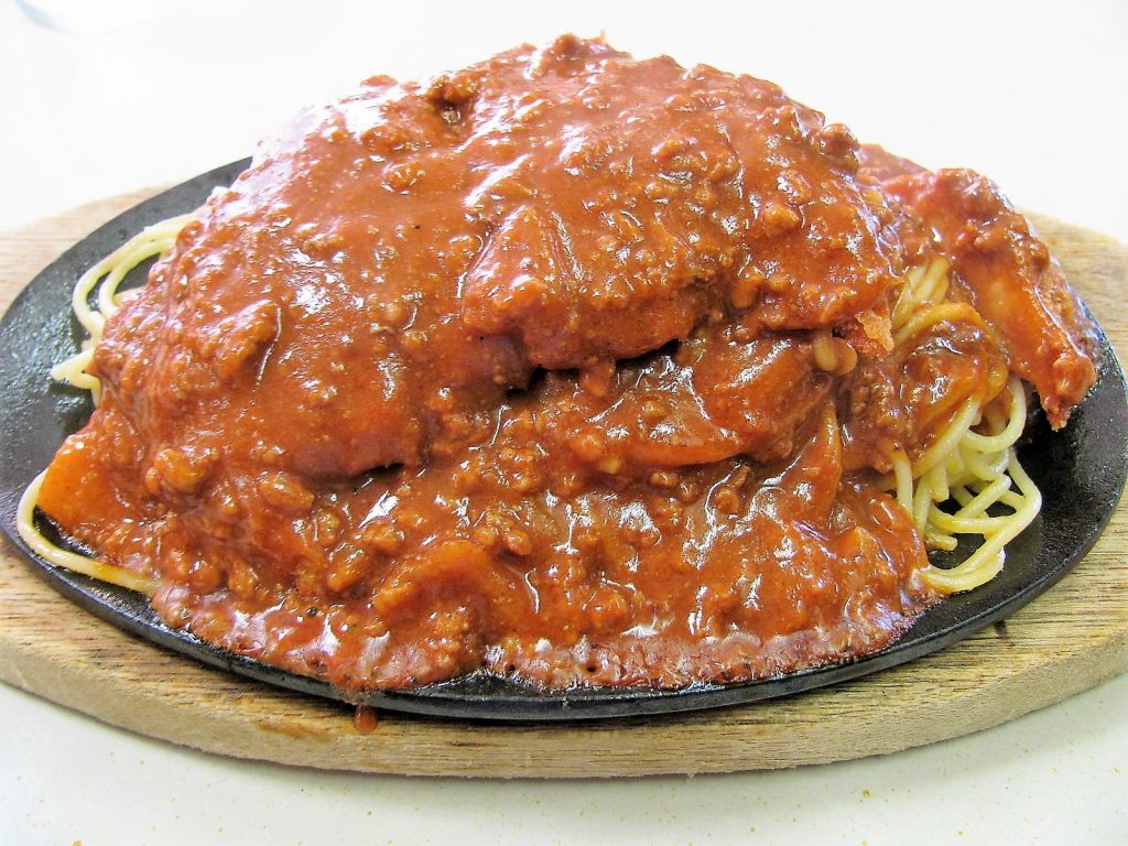解説にあるように、これは凄まじい食い物です。熱々の鉄板に山盛りのスパゲッティ、そこから転げ落ちそうになっている大きなトンカツ、さらに、その上から「これでもか!」と言わんばかりにかけられたミートソース。