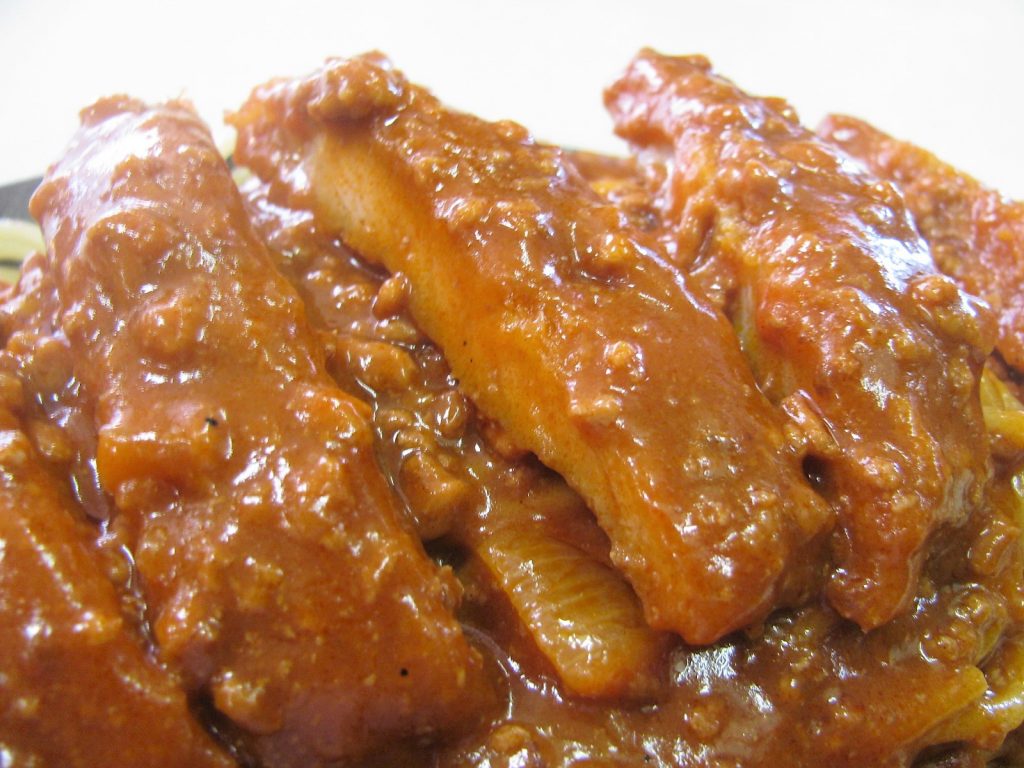 そのソースが鉄板に触れ、バチバチッと大騒音をたて、「ヘン!食べられるものなら食べてみろよ!」的なお姿で前に供されます。連続の2度目の食事にしては、見た目だけでも・・・でも、果敢に挑戦です。