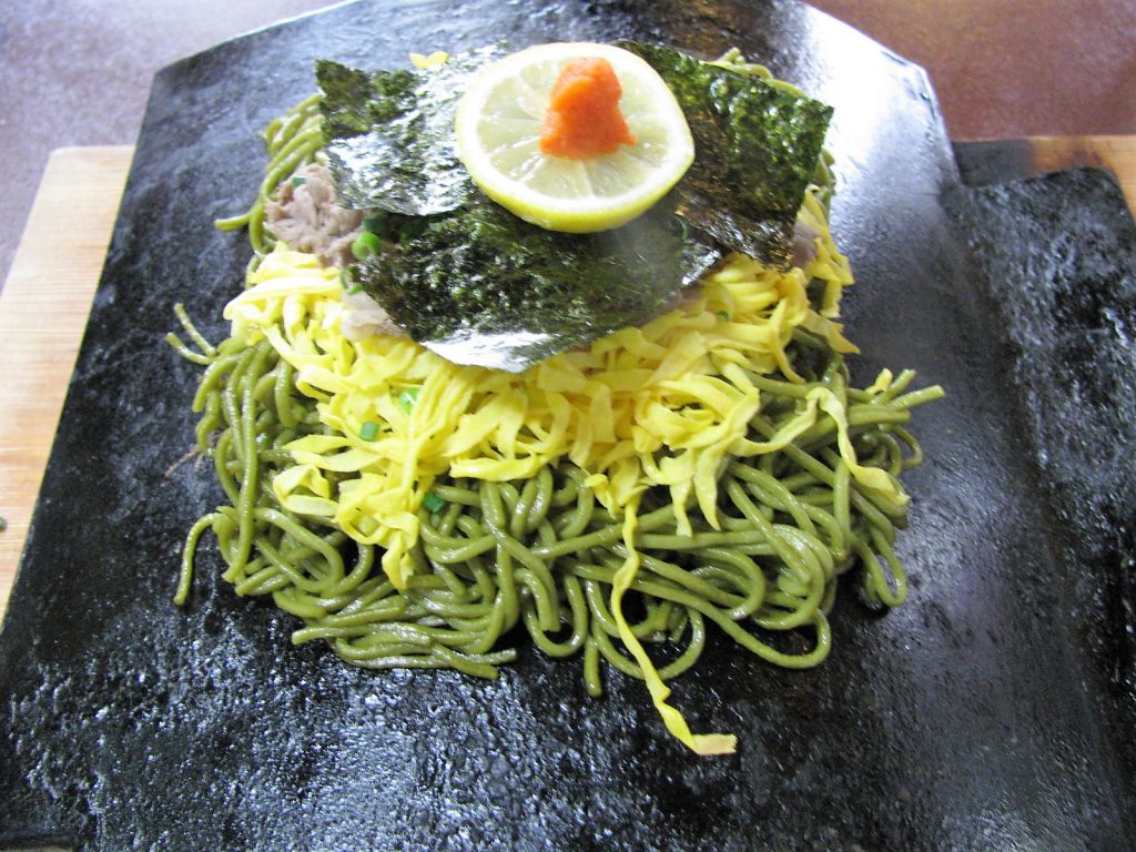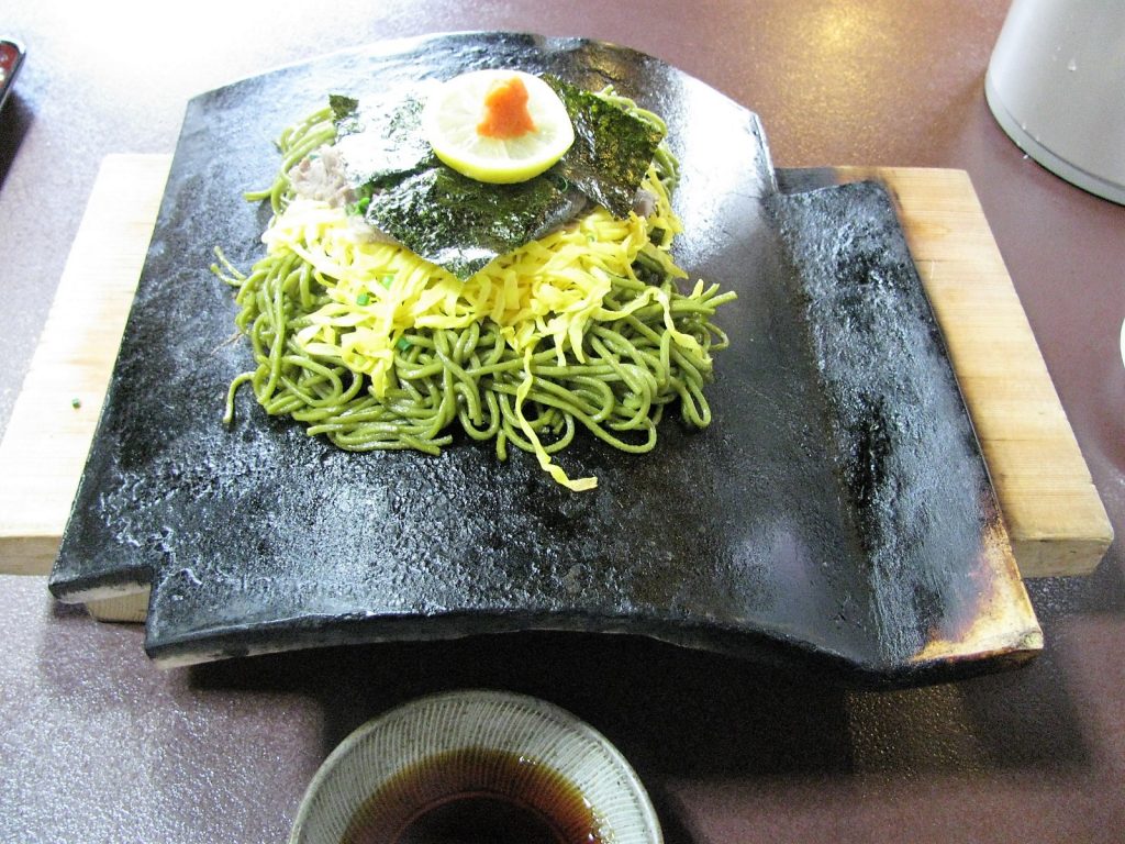いや~、変わっているネ。熱した本物の瓦の上に、茶そばが“ちょこんなん”と乗っている。そば好きの江戸っ子が見たら、思わず卓袱台(ち ゃぶだい)をひっくり返すところですヨ、ほんと。(※え?ちょっと古い?)