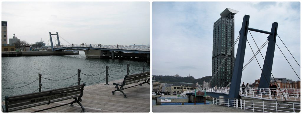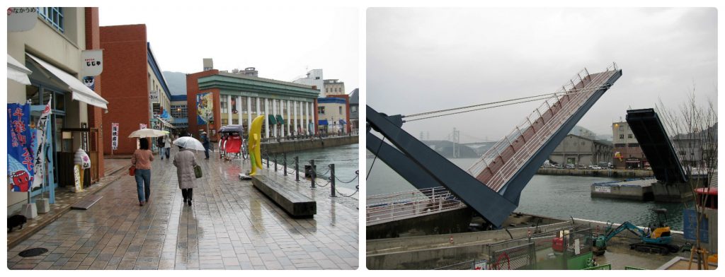 右:雨の中でも行われます。 「ブルーウィングもじ」の はね橋開閉の観光イベント。 でも誰もいません・・・