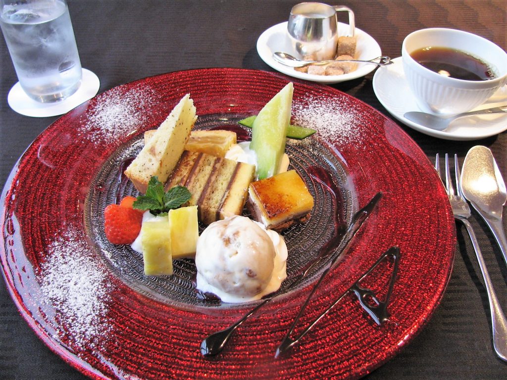 その門司港ホテル内にある「PORTONE」は、ホテルのメインダイニング。それだけに重厚感のある立派な店内です。コーヒーだけ注文のはずが、ついつい雰囲気に押されて、ケーキセットなるものを頼んでしまいました。また、甘いものです。 (※あなたの辞書に学習という文字はあるの?)