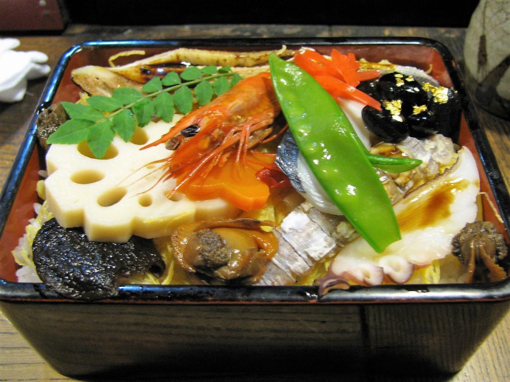 重箱に入った「烏城黄金ずし」を出しつつ、またまたご主人の解説です。「これは、岡山ばらすし(※’10旅B春篇 岡山で紹介済み)のバージョンアップ版で、上に乗っている寿司ネタが全部贅沢になっているんです。これが・・・これが・・・」「へー・・・」が、ご主人のネタ解説は残念ながら忘れてしまいました。・・・そこで、「烏城黄金ずし」について解説です。
