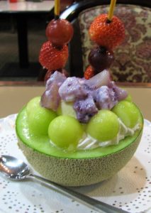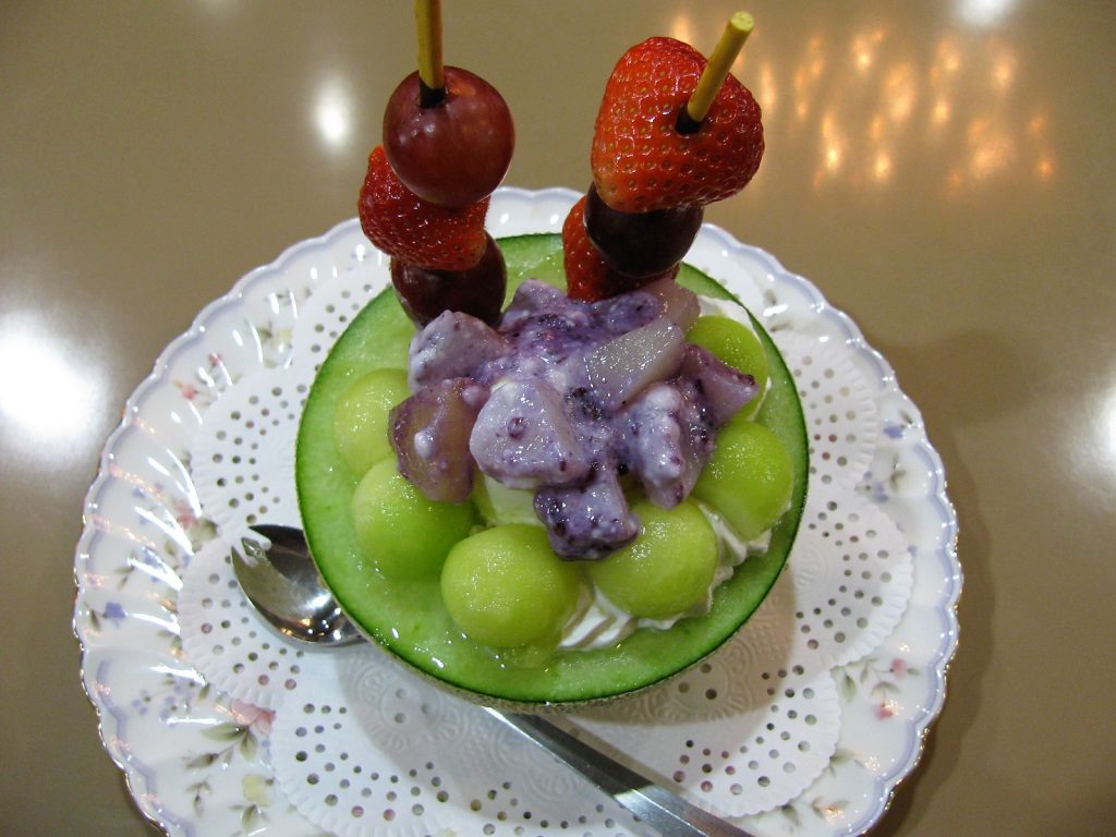 第一印象は・・でかい!何せメロンを半分カットしたものがベースになっています。その上にフルーツやアイスで飾り付けがされて・・・