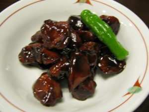 甲府鳥もつ煮は、山梨県で食べられている、ニワトリのモツを砂糖と醤油で煮込んだ郷土料理。一般的なもつ煮のような煮込み料理のイメージとは異なり、完成品は水分が少なく、照り焼きに似た状態となる。