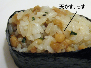 「むすび」とは、小生たちが言うところの「おにぎり」のことなのです。そして、“たぬき”とは、蕎麦・うどんにあるように「天かす入り」のこと。要は、天かす入り混ぜごはんの「おむすび」が“たぬきむすび”というわけなのです。とんだ思い違いです。(※ひょっとして小生だけの誤解だったのか?・・・)