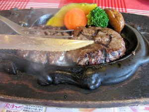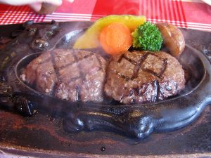 それをまたおネエさん、鉄板の上に“フォークの親方”のような器具で、押し付けます。更にジュージューと悲鳴を上げるハンバーグ・・・結局、普通のハンバーグ2つに成り下がってしまいました。