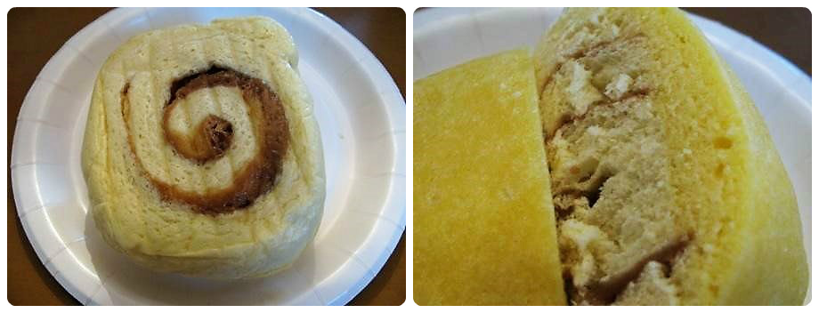 特製クリームがかかった蒸しパンは、生地が二層になっており、下層部分にうずまき状にソースが練りこまれており、もっちりとした食感が人気。