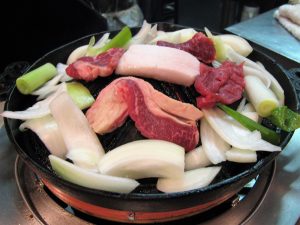 ※調理には専用の鍋であるジンギスカン鍋が用いられる。この鍋は、主に鉄製で、中央部分が兜のように盛り上がった独特の形状をしており、その表面には溝が刻まれている。