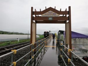 この季節だけしか停まらない臨時駅「ラベンダー畑」に到着です。しかし、季節限定の暫定駅なだけあって、荒野の中にポツンとホームがあるだけです。