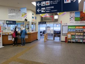 そこで、待合いスペースの片隅にある「臨時観光案内所」のおばちゃんに話しかけます。テーブルと椅子だけの簡易案内所です。