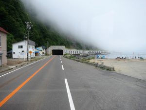 国道336号の「広尾町音調津-えりも町庶野」の33.5kmのこと。1934年竣工で、竣工当時の名前は日勝海岸道路。黄金を敷き詰められるほど、建設に莫大な費用を投じ、断崖を切り開く難工事の末に開通したことが名称の由来。※Wikipedia