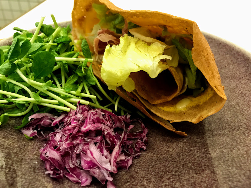 - 小麦粉のクレープと違って、そば粉の生地が表面パリパリ香ばしく、具材の部分はしっとり柔らか。そのコンビネーションがエエね!