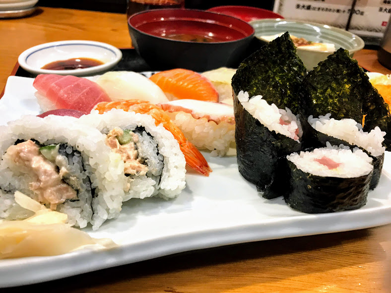 すし定食大盛 ¥700+100 ※にぎり5カン+3カン・うら巻・巻物・赤だし・とうふ・揚げ物