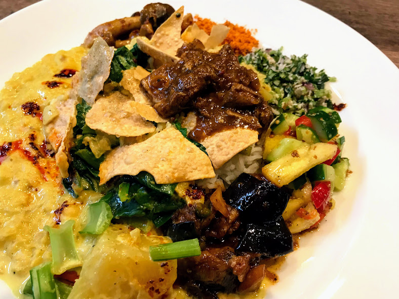 • カレーは、深いコクがあって旨味も半端ない。しかも、小生好みにかなり辛い仕上り。ただ、いろんなものを混ぜて食べるので、さほど気にならない。が、後でジワリと刺激がやってくる。美味いわ!