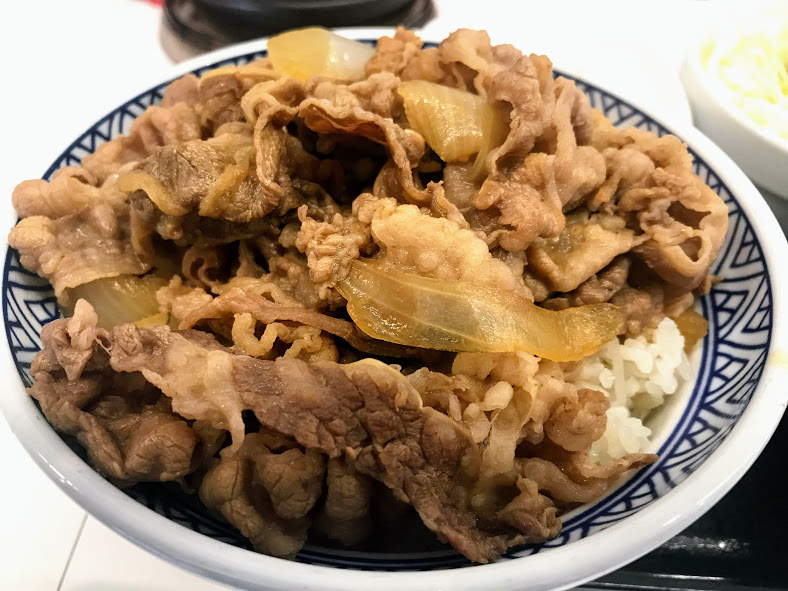 ※ 肉だく牛丼 – 店頭にのぼりを掲出するぐらい力を入れている、現在売り出し中の商品。ただ、通常牛丼と比べ肉の量が多いだけの代物。味は全く変わらない、、
