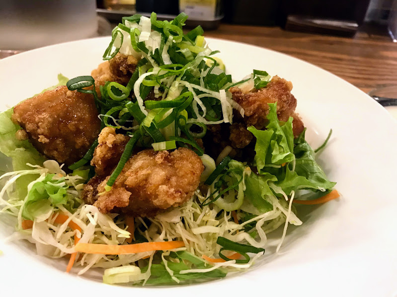 - 油淋鶏も、揚げ具合はもちろん、タレの甘辛酢醤油も完璧。おまけに、敷いてある野菜類も量が多く、タレが染み込んで更に美味い。これだけで、ご飯二杯はいけるワ。