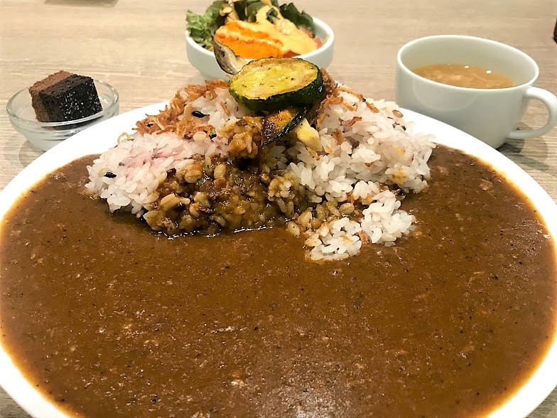 - 予想よりボリュームがあり、惜しげもなくたっぷりかかったカレーが食欲を誘う。湖に浮かぶ中島のように存在する雑穀米ライスがまたイイね。気が利いてるよ。