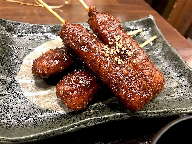 - 串カツも大きく立派なもので、しかも4本もある。レンチンじゃない揚げたてが嬉しいネ。サクッとした食感、嫌味のない甘辛味噌ダレ、これを”美味い!”と言うンです。