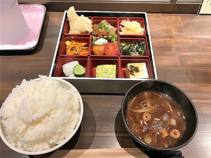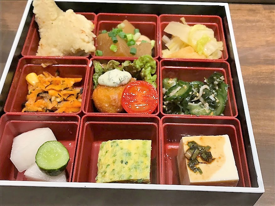 - おかずは、割子に仕切られた区画の数だけ9種類もある。なんか駅弁の幕の内弁当みたいで楽しくなる。が、※減点ポイントに続く