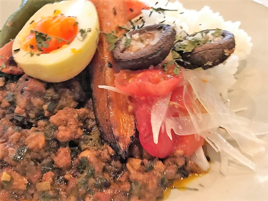 新鮮な野菜とスパイスとのコンビネーションによる旨味たっぷりのカレーが自慢。それもそのはず、野菜はオーナーの実家である『八百吉商店』から仕入れたもの。日本料亭などへの卸しを行う同店が毎朝市場で厳選した新鮮な野菜を使っている。カレーのベースでも「Okome(お米)」か「Yasai(野菜)」を選ぶことができる。