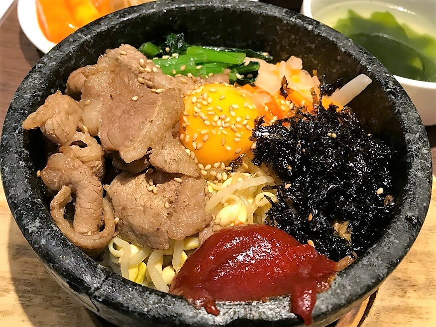 ※ビビンパ:朝鮮料理のひとつ。丼や専用容器にご飯とナムルや肉、卵などの具を入れ、よくかき混ぜて食べる料理で、コチュジャンやごま油などの調味料をかけ、匙(スッカラク)でよく混ぜてから食べる。ご飯の上に盛られている具は本来5種類とされ、手前・奥・右・左・中央に分けて盛られている。※Wikipedia