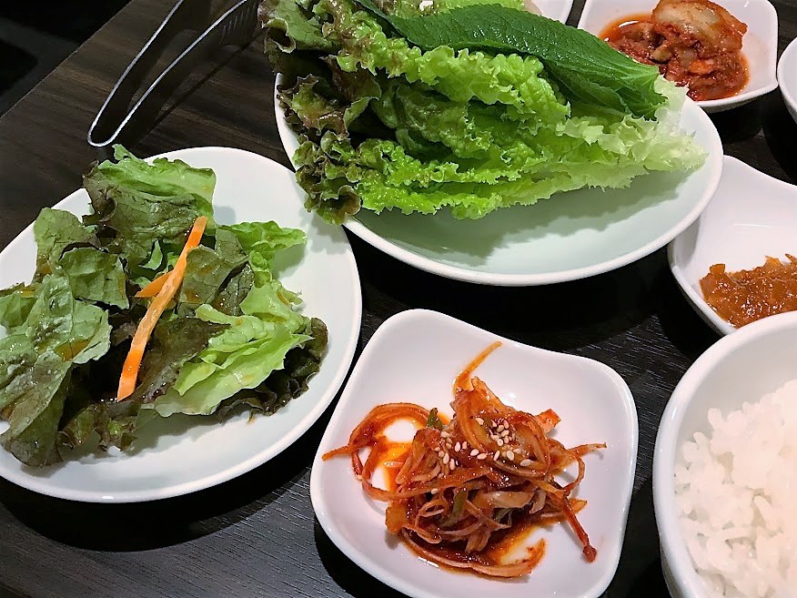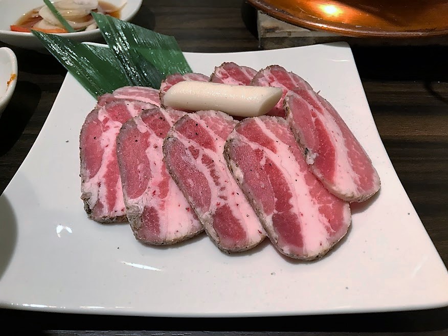 ※ サムギョプサル:スライスした豚のばら肉を焼いて食べる朝鮮の豚バラ焼肉である。朝鮮語で「サム」は数字の3、「ギョプ」は層、「サル」は肉を表し、日本でいう三枚肉(ばら肉)を意味するが、一般的に「サムギョプサル」と言えば三枚肉の焼肉料理のことを指す。※Wikipedia