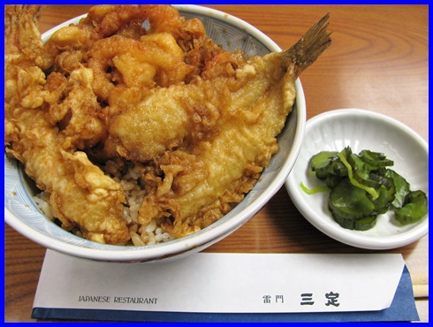 天丼:丼鉢に盛った飯の上に天ぷらを載せた日本の丼物。天ぷら丼の略称であるが、今日ではもっぱら「天丼」と呼ばれている。