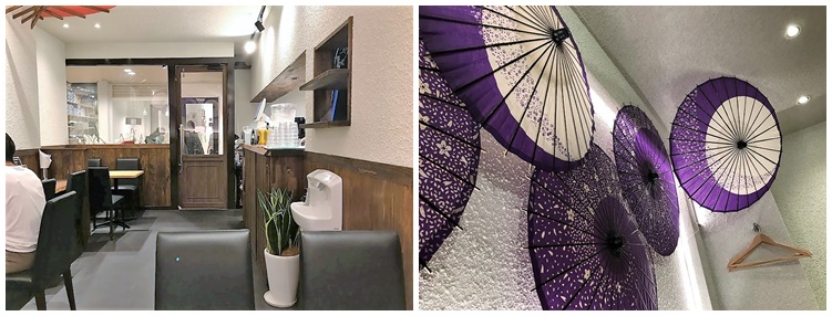 - 店内の装飾が何故か和のテイストだが、美しい和傘に囲まれて、、なんか落ち着くナ。