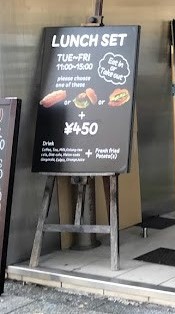 - 帰る時に気づいたのだが、店頭ボードにランチセット(ホットドッグ・ドリンク・フライドポテト)が案内されている。それによると、、小生の合計額はホットドッグ710円に+450円、、つまり1160円のはず、、160円も損してしまったワ。(😇お客さん、スパイシーは対象外なんッす、エヘヘ、、?)