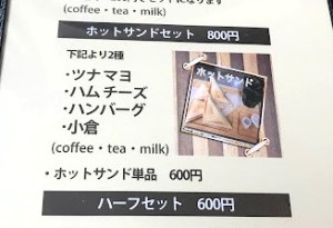 - ホットサンドは、下記の4種から2種選べるとのこと。1種限定と思い込んでいたので嬉しさ倍増だ。なんか嬉しい。なお「ハーフセット」は1種縛りながら600円と安くなっている。こちらも魅力あるナ。(😇はい、お店の宣伝、ご苦労さん、、?)