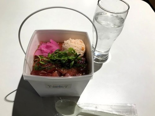 - ポキ丼が取っ手のついたコンパクトな美しいパッケージで出てきた。中を覗くと、ポキも整然と並んでいる。美味そうだ。でもこれって、テイクアウトと同じ形状?、、なんだかな、、(😇だったら、外の公園で食べたら?ちょっと寒いけど、、?) ※減点ポイントに続いていく、、?