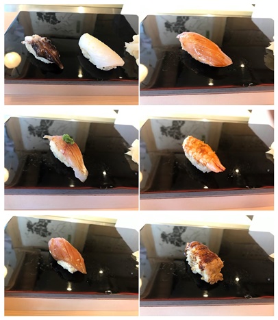 ※寿司ネタは、スミイカ(コウイカ)、とり貝、真鯛、カンパチ、鯵、海老、メジマグロ漬、穴子の8貫