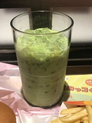 - 今日のようなピーカン日には、季節がら気温が急上昇することが予想される。だから、ドリンクをアイス抹茶ラテにした。新緑の季節にピッタリのグリーンが映えてるナ。口の中も爽やかだ。が、※減点ポイントに続く、、(😇やな感じ、、)