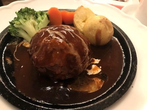- さすがハンバーグは、長年好評を得ているだけあって上等の出来だ。うまい。特にその形状が、静岡「さわやか」の“げんこつハンバーグ“に似て球体でデカい。しかも中まで完全に火が通っていて、その調理技術が高いことが窺える。素晴らしい!しかしながら、※減点ポイントに続く、、