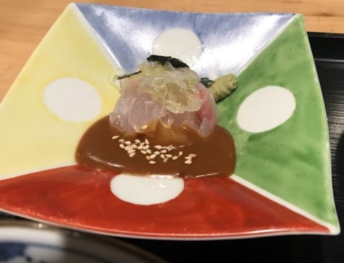 - まず鯛をごまだれで食べてみる、、鯛のさっぱりした味に合わせるかのように、ごまだれもあっさりした味付けで、全体がまろやかになっている。その分 鯛の旨味を強く感じる。うン、うまい!