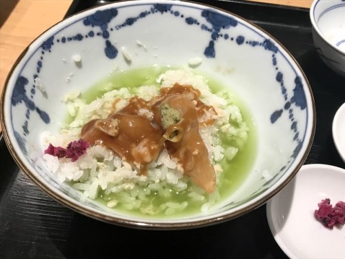 ③最後にひとくち お茶漬けで。福乃のごまだれで和えた鯛とたっぷりのお茶で。