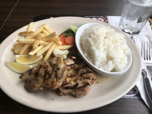 - レモンステーキとあるが、佐世保のご当地グルメ「レモンステーキ」とは違うもののようだ。グリルしたチキンに生のレモン汁を搾りかけるだけというもの。それに佐世保は牛肉だが、この店はチキン使用。土台違う料理なのだ。納得した。(😇佐世保?、、あんたがスパイ容疑で捕まったところ?、、?)