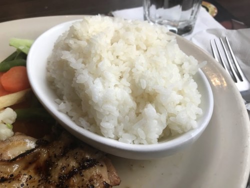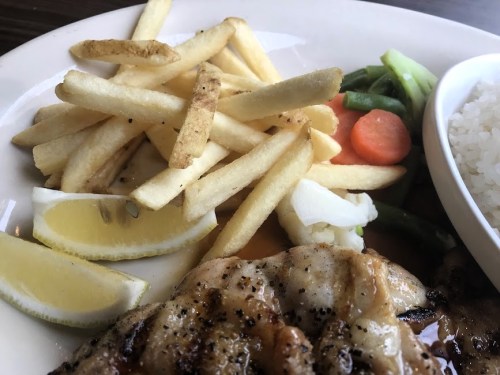 - グリルチキンの味付けが良い。パリッと焼き上がったチキンの皮に醤油ベースのソースがよく絡んで、タンパクな鶏肉に変化をもたせている。うまい!
