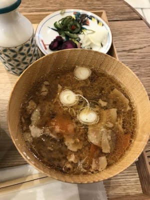 - 汁物は「豚汁」。出汁もよく効いてるし、その上 豚肉の旨味も加味されて、、これは最上級の出来だ。うまい!量もけっこうあるしネ。ほら、卵かけご飯と変わらない器だ。(😇卵かけご飯が小さいッて噂もあるが、、?)