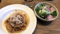- 思ったより茶そばはイケてる。少しドギツい緑色ではあるが、そばの出来は良い。とてもおネエさん料理人が作ったとは思えないほどだ。(😇出たな、偏見ジジイ、、)ちゃんと腰もあり、抹茶の風味もその色ほどキツくない。程よい味わいだ。うまい。