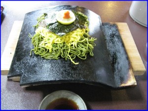 茶そば:そば粉に抹茶を練りこんで打った変わりそばの一種。静岡県の郷土そばとしてが有名だが、山口県では、この茶そばと具材を瓦の上で熱し、温かいめんつゆで食べる名物料理がある。「瓦そば」と言う。※日穀製粉HPより抜粋