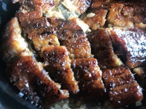 - お櫃いっぱいに横たわっている鰻の蒲焼きたち、0.75尾とはいえ想像より量が多い。大満足だ。(😇刻んであるンで、横に拡げられるからサ、、?)