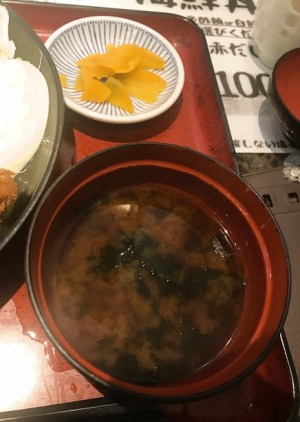 - あちっ!味噌汁を取ろうとして、危うく器を倒してこぼすところだったワ。器が熱圧力によりおぼんにくっ付いていたせいだ。あ〜危なかったナ。(😇イチャモンつけてンじゃないの!それは、、あんたの手の震えのせい、、?)