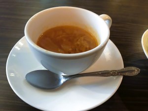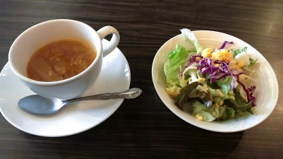 - スープとサラダがすぐにサーブされた。ま、洋食屋の流儀なので致し方なく甘受しよう。それではお先に頂きます!(😇そう、流れに合わせていれば、世の中からこんなに忌み嫌われないンだよ、、?)